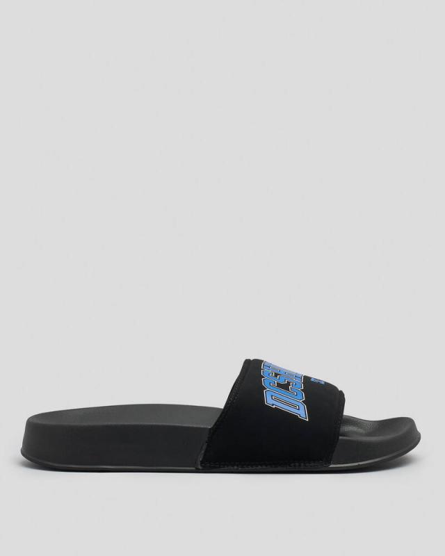 Brand: DC Shoes Product: Mens DC Slides Pattern: Plain Trim Detail: Logo print detail Sandal Style: Slides Shoe Features: Lightweight, Moulded Sole Heel Type: Flat Heel Sole Material: Rubber sole